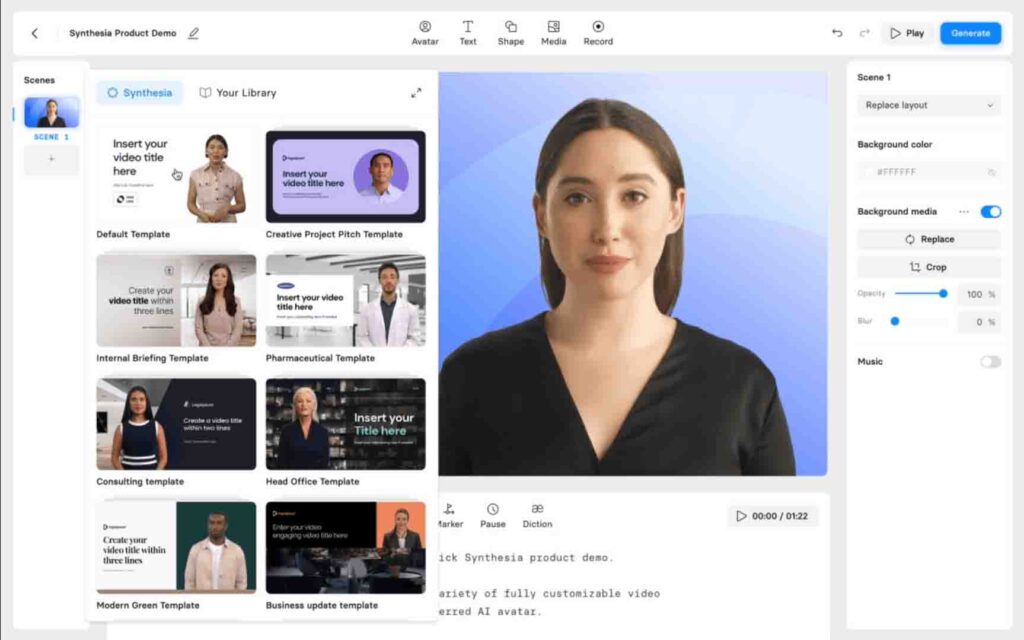 Synthesia is ideal for enterprisesHR departmentstraining organizations, and educational institutions that need to create consistent, professional presenter videos at scale. It’s particularly valuable for global organizations requiring content localization across multiple languages and regions.
